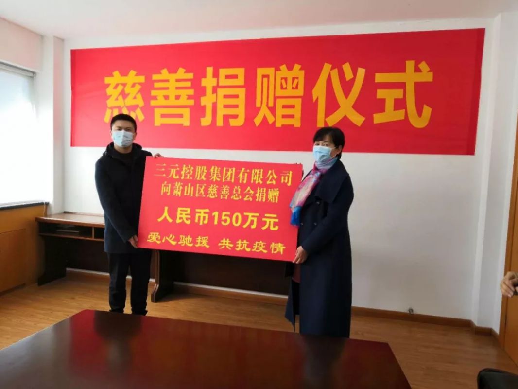 2月17日,三元控股集團董事長李斌專程前往蕭山區慈善總會,捐贈150萬元支持新冠肺炎疫情防控,其中50萬元定向捐助給黨灣鎮。蕭山區慈善總會名譽會長王珠瑛接受捐款并向三元控股集團頒發了捐資證書。